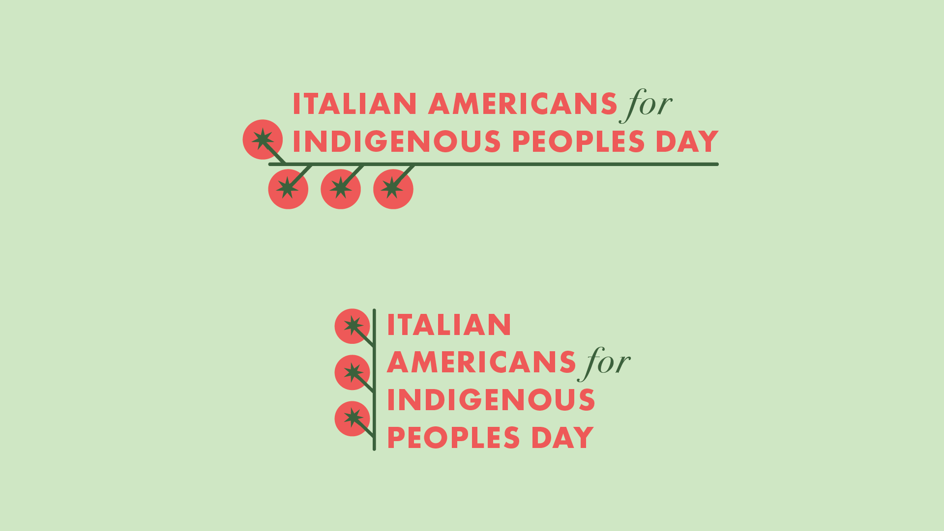 This brand was created for Italian Americans for Indigenous Peoples Day, an organization focused on rethinking cultural identity and connection. The design centers on a tomato on the vine — a familiar symbol of Italian heritage that also carries a deeper story. The tomato, while iconic in Italian cuisine, originated in the Americas, making it a natural bridge between the two cultures.